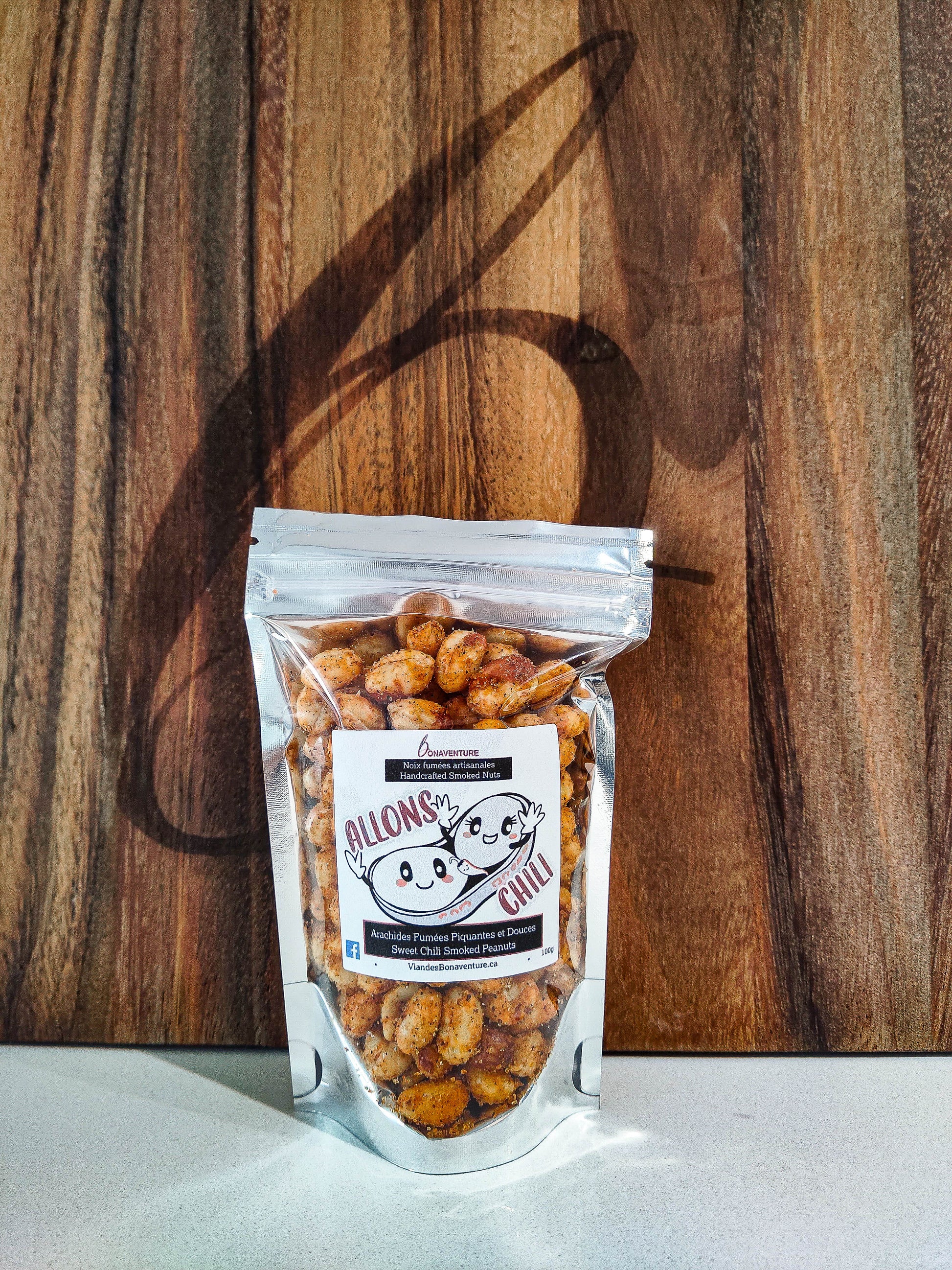 Nos arachides au chili doux sont préparées à la main de façon magistrale ici même à Saint-Lazare, au Québec ! Nos techniques de fumage, nos mélanges d'assaisonnements faits à la main et, bien sûr, notre assurance de la qualité et notre emballage sont tous réalisés par notre équipe dévouée !