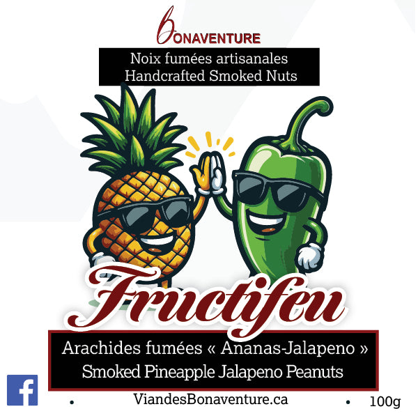 Fructifeu est le nom de nos toutes nouvelles arachides et noix de cajou fumées aromatisées à l'ananas et au jalapeno. Conçus avec un équilibre de saveurs tropicales et une modeste dose de chaleur, notre objectif est que vos papilles vous transportent dans un paradis tropical, où que vous soyez et quoi que vous fassiez !